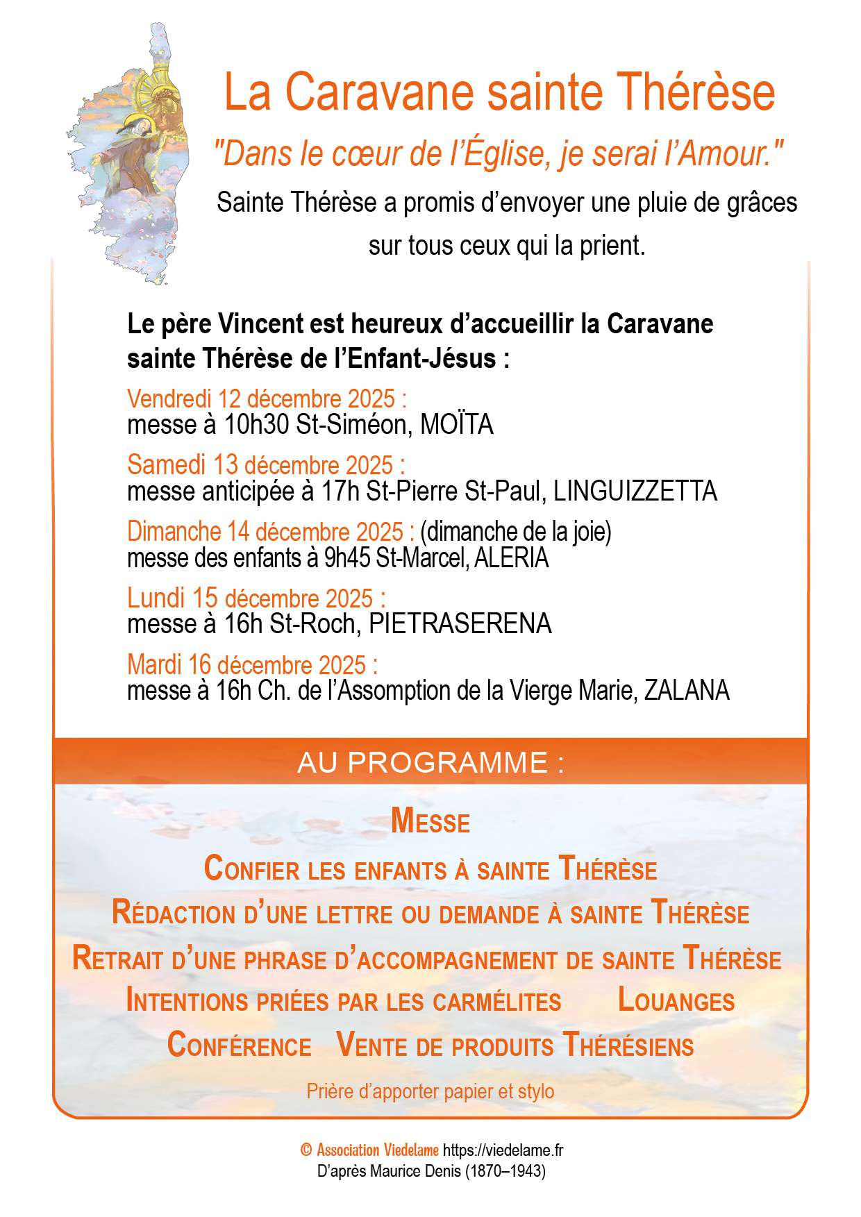 Messes en Oriente – Caravane Sainte Thérèse – Le Père Vincent est heureux d’accueillir la caravane Sainte-Thérèse de l’Enfant-Jésus. Le 12/12 à Moïta : 10h30 – Le 13/12 à Linguizzetta à 17h – Le 14/12 à Aleria : 9h45 – Le 15/12 à Pietraserena à 16h – Le 16/12 à Zalana à 16h. Au programme […]