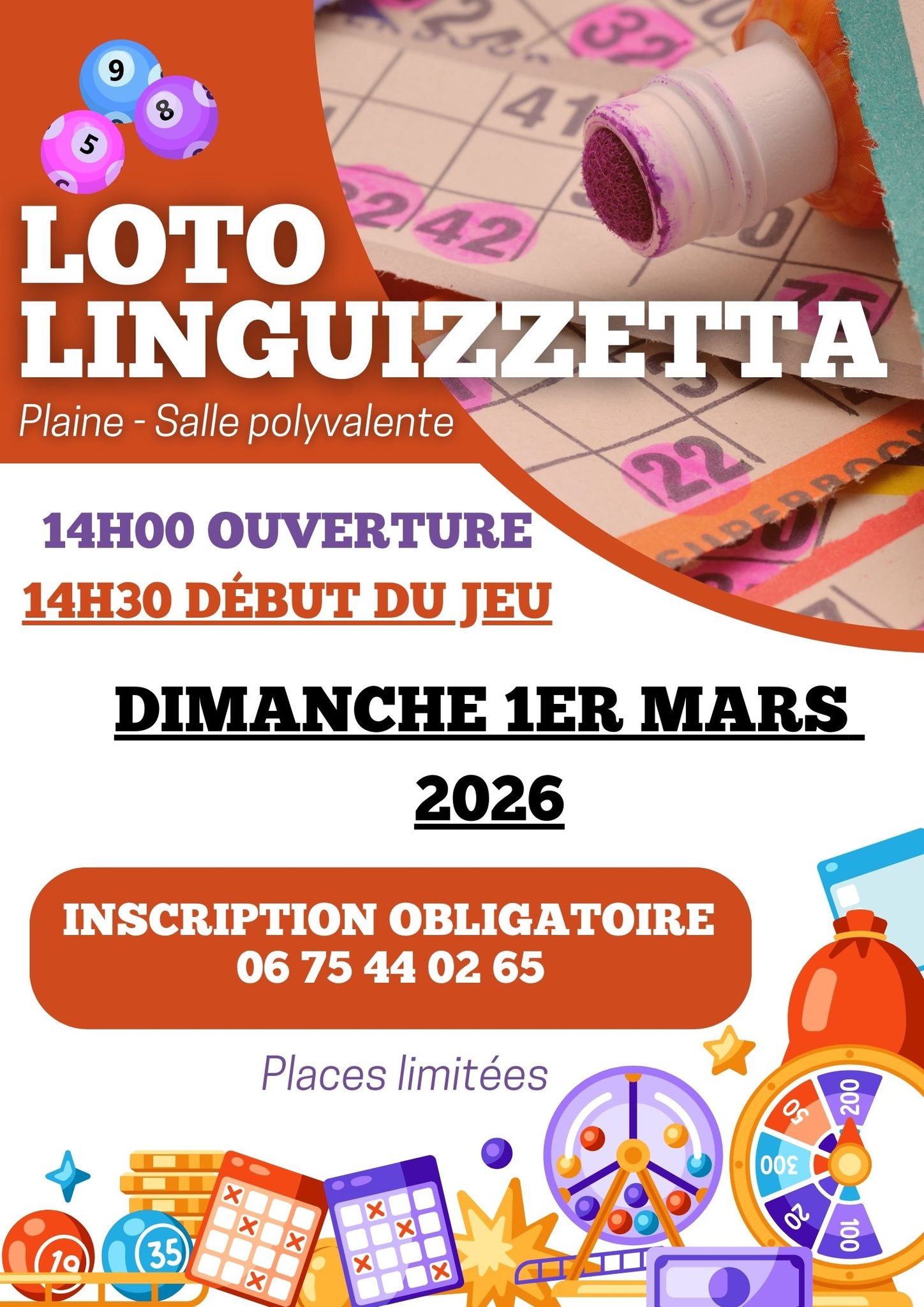Loto organisé par la commune de Linguizzetta – Salle polyvalente en plaine de Linguizzetta – Places limitées – Inscription obligatoire au 06 75 44 02 65