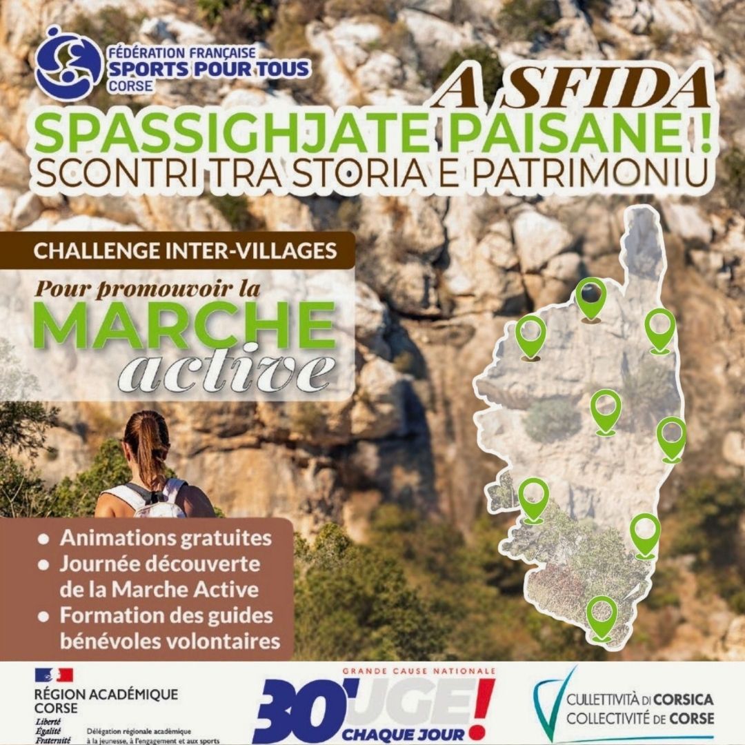 A SFIDA PASSIGHATA PAISANU - Scontri Storia è Patrimoniu! A 100% free, sporting and friendly adventure linking health, culture and the region ??? ? Walking together means moving in a different way, discovering our heritage and creating links! On the programme for each stage: ? A day of activities supervised by professionals: walking, sticks, digital tools, guided walks, etc. ? Training for volunteers to keep the activity going in each commune ? An inter-municipal challenge to take up the challenge together!? Take up the challenge and represent your municipality! Further information: 04 95 38 90 10