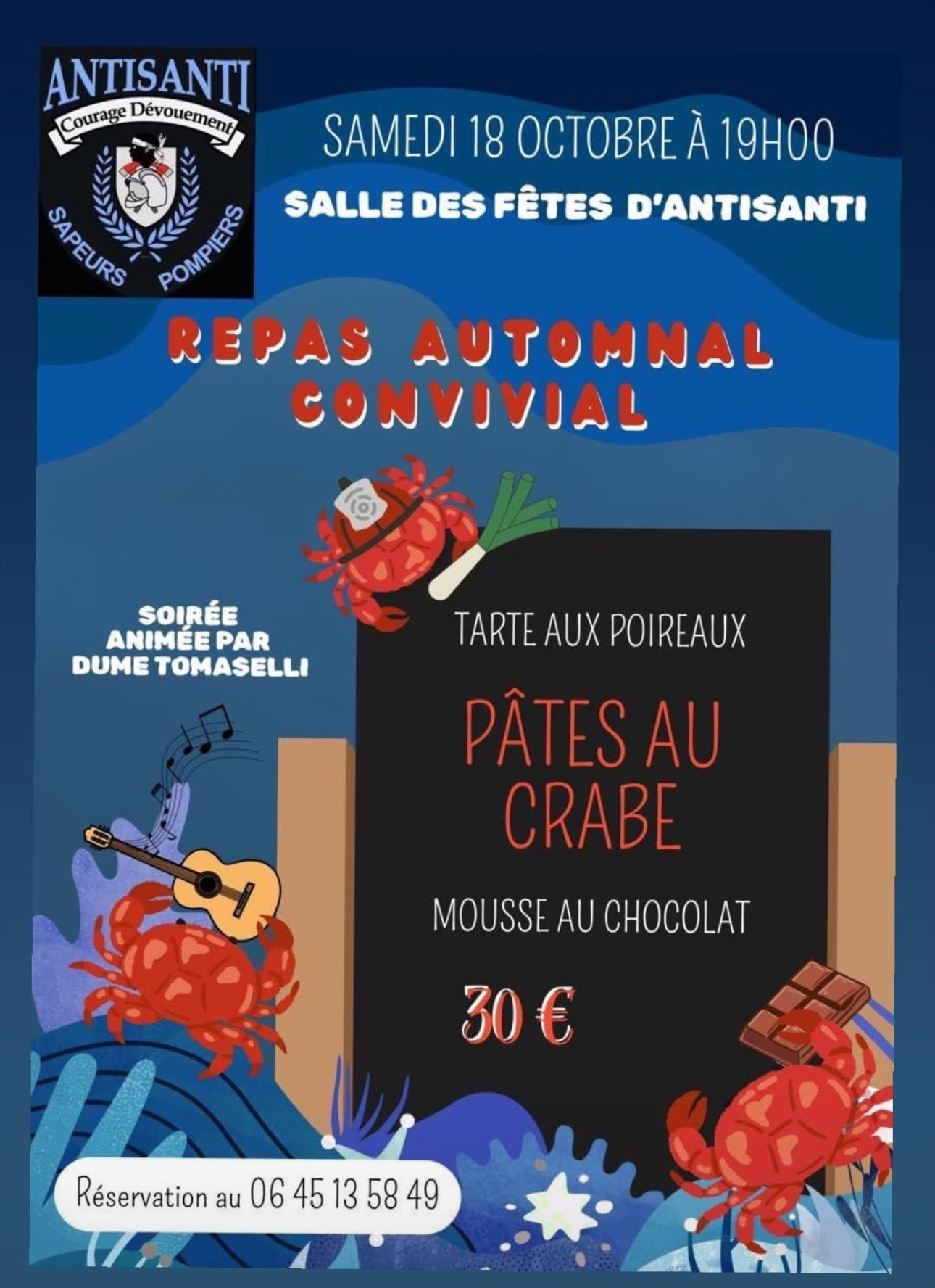 Autumnal meal €30/person (leek tart - crab pasta - chocolate mousse), hosted by Dumé Tomaselli. Bookings: 06 45 13 58 49