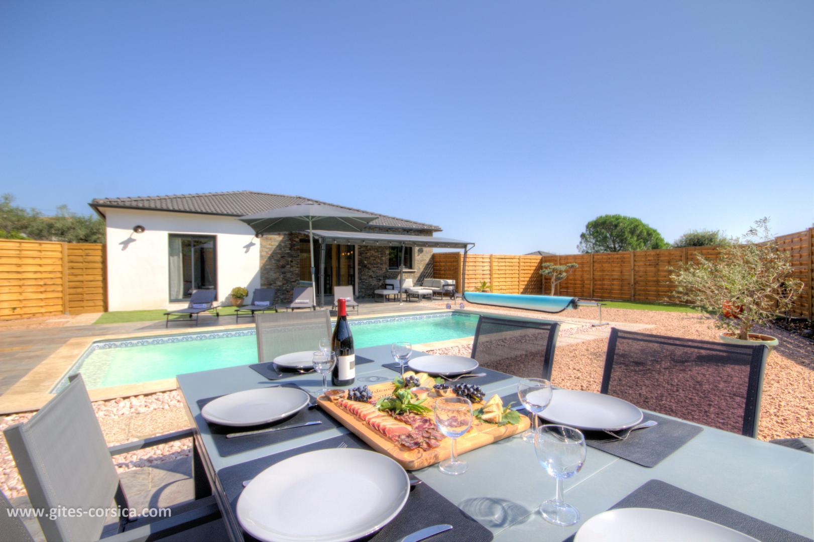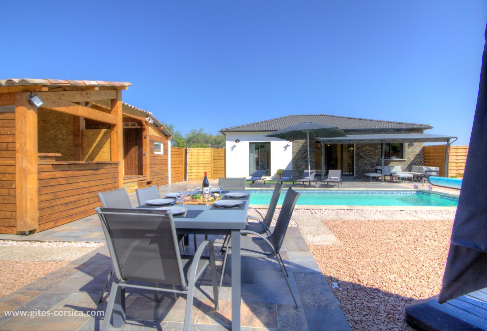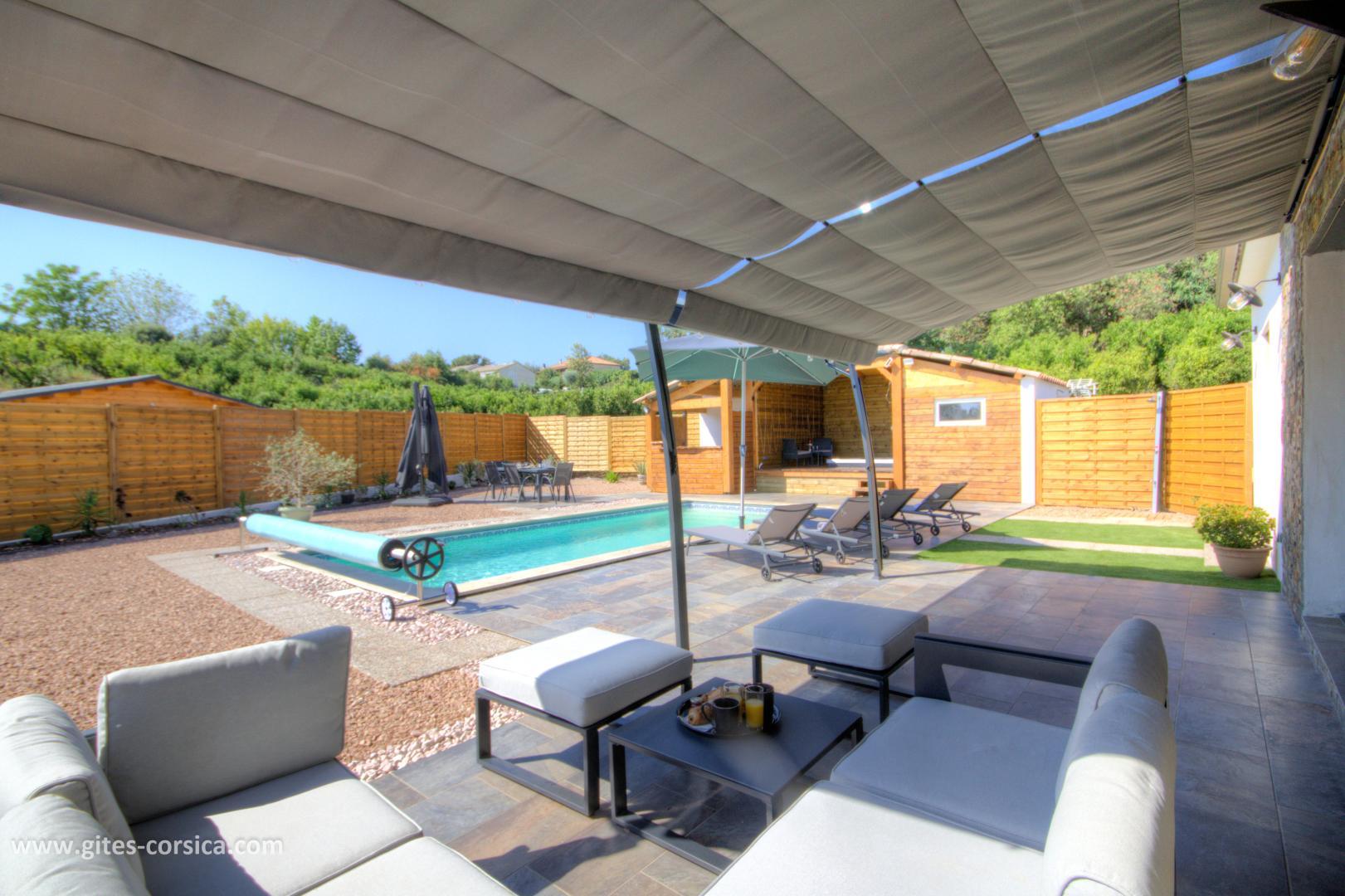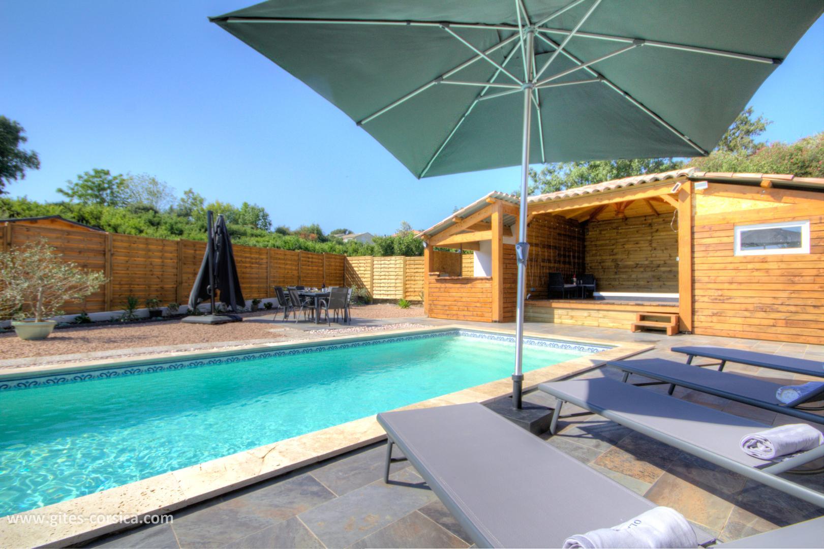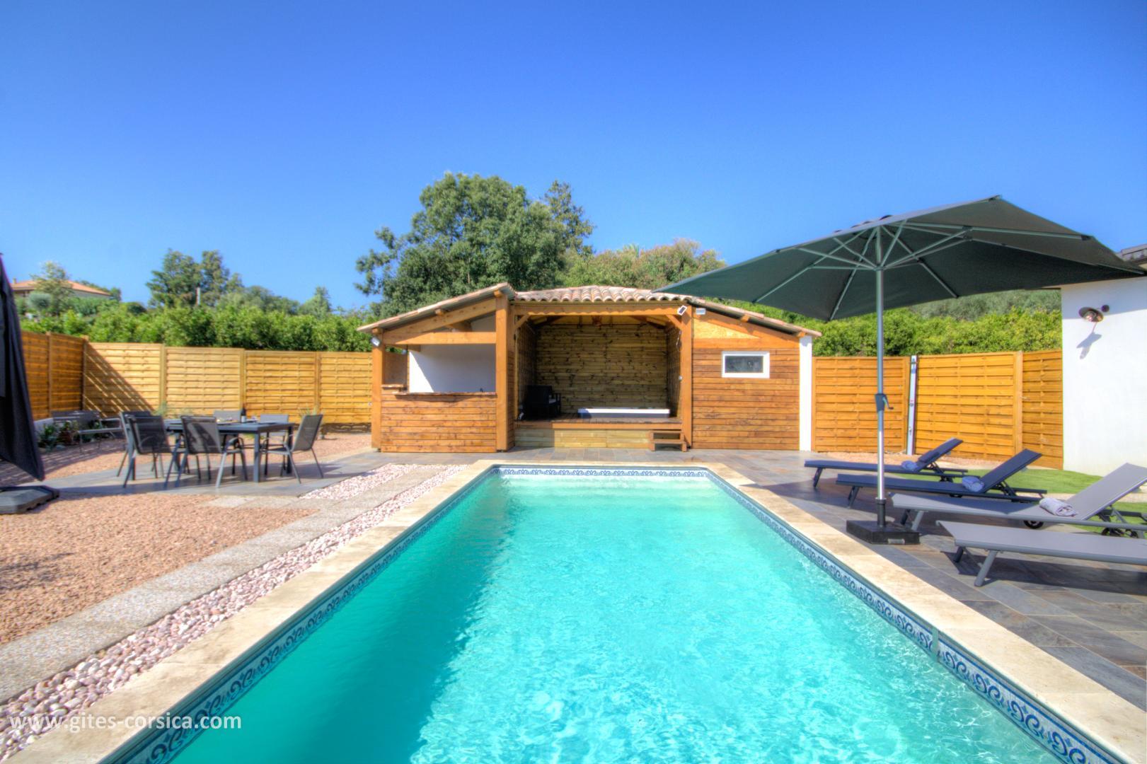 Sur une propriété de 6000 m² dans la plaine d'Antisanti, maison indépendante de 93 m² à proximité d'un autre gîte (63841). Elle se compose ainsi : - Séjour/cuisine - 2 chambres comprenant chacune 1 lit en 180x200 cm avec salle d'eau/WC privative - 1 chambre comprenant 2 lits en 90x200 cm - Salle d'eau - WC Propriété sous vidéosurveillance avec enregistrement des images. Le dispositif sera activé uniquement après accord du locataire. Le client devra faire part de son, accord ou de son refus à la signature du contrat de location - Terrasse de 250 m² - Salon de jardin - Salon de détente - 6 bains de soleil - Piscine (8x3,5 mètres, profondeur : 1,5mètres) ouverte et chauffée du 19 avril au 11 octobre, sécurisée par une alarme sonore. La piscine est à usage exclusif des locataires - Dans une espace bien-être fermé et chauffé avec salle d'eau/WC, spa (2.2x2.2 mètres : 3 places assises et deux places allongées, ou 7 places assises), ouvert toute l'année - Cuisine d'été avec plancha gaz, 2 feux gaz, évier et réfrigérateur - Borne de recharge électrique (7 kW) - Parking dans la propriété (portail électrique) En commun avec la deuxième location : - Salle de sport avec appareils de fitness (tapis de course, rameur, elliptique, vélo d'appartement), baby-foot, télévision, billard et enceinte connectée - Terrain de pétanque - Climatisation - Lave-linge séchant - Lave-vaisselle - Micro-ondes - Congélateur - Télévision dans le séjour et dans chaque chambre - Lecteur Blu-ray avec quelques DVD Blu-ray à disposition - Wi-Fi - Enceinte connectée - Sèche-cheveux - Sèche-serviettes - Lits faits à l'arrivée - Draps de piscine et de spa fournis A réserver auprès des propriétaires et en supplément : - Petit-déjeuner (salé, sucré ou continental) - à partir de 8€/personne - Séances de massages assurées par prestataire extérieur (tarifs selon carte) - Coiffeuse (tarifs selon carte) - Ménage en cours de séjour (tarifs définis sur place)