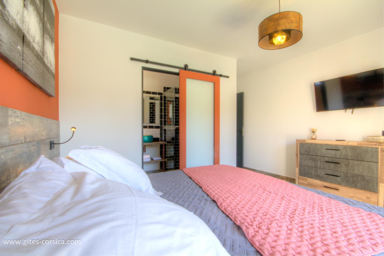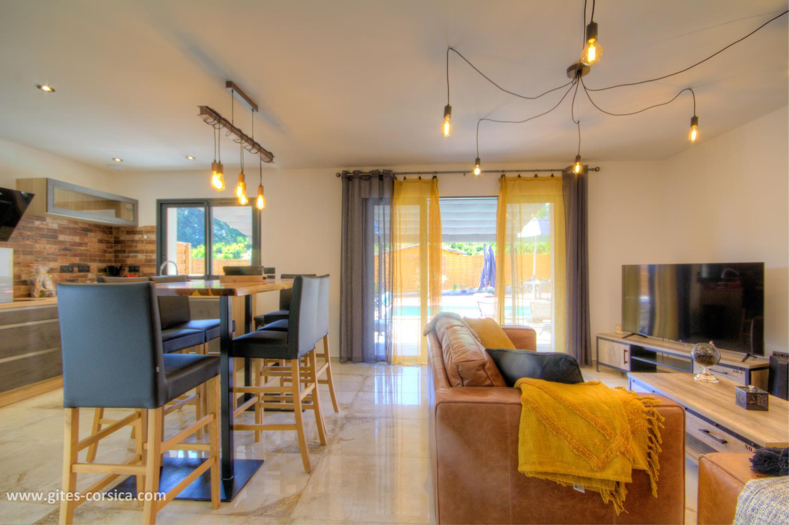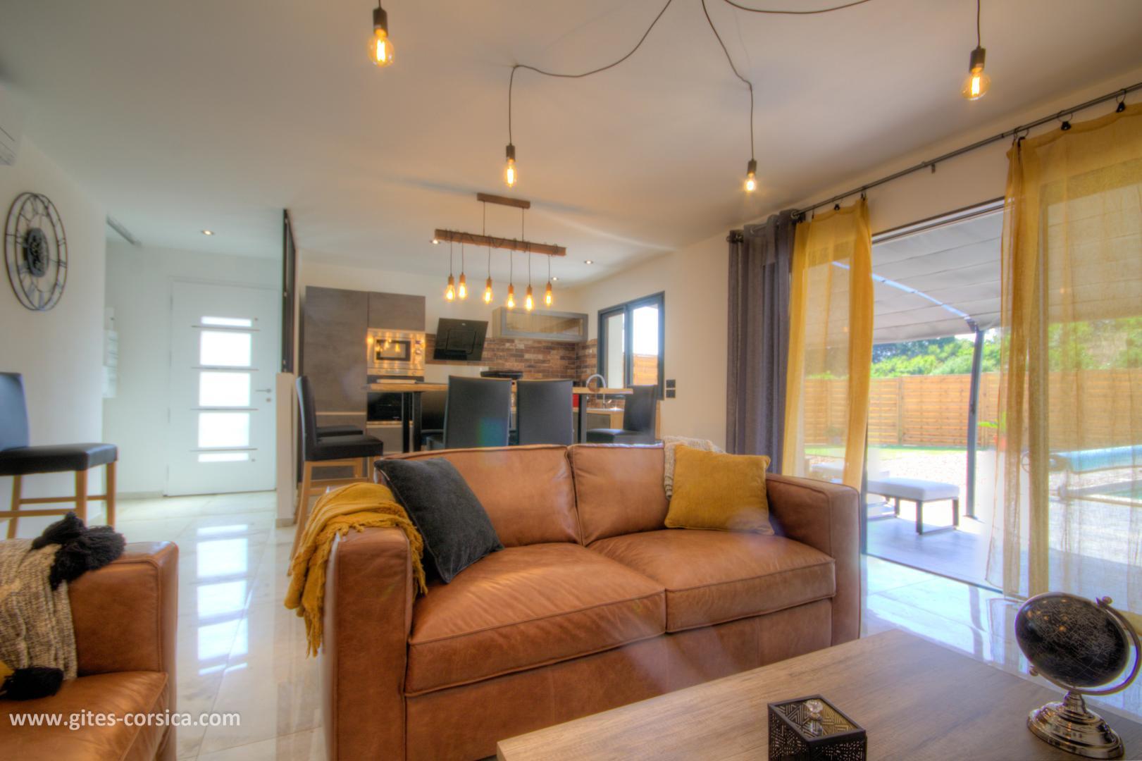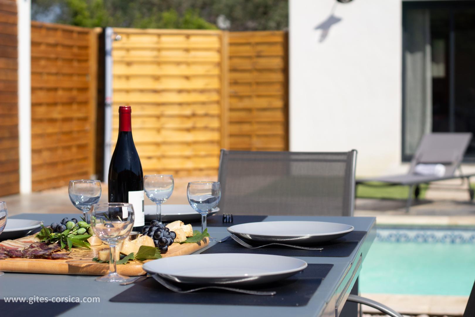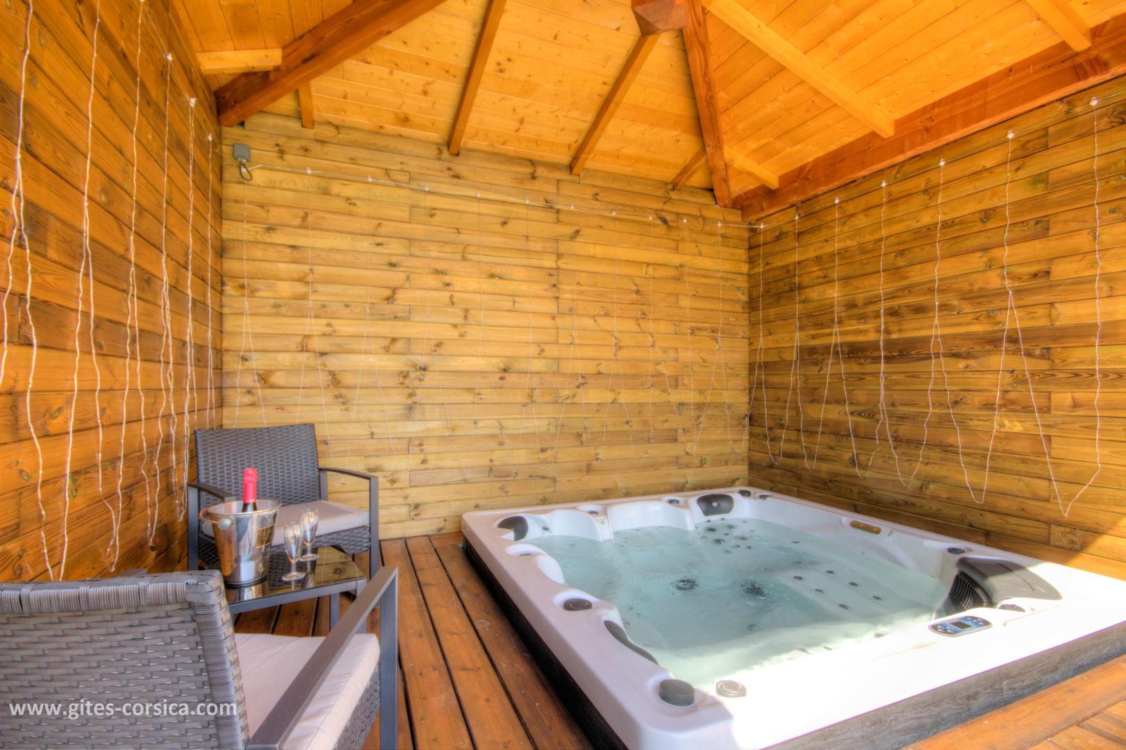 Sur une propriété de 6000 m² dans la plaine d'Antisanti, maison indépendante de 93 m² à proximité d'un autre gîte (63841). Elle se compose ainsi : - Séjour/cuisine - 2 chambres comprenant chacune 1 lit en 180x200 cm avec salle d'eau/WC privative - 1 chambre comprenant 2 lits en 90x200 cm - Salle d'eau - WC Propriété sous vidéosurveillance avec enregistrement des images. Le dispositif sera activé uniquement après accord du locataire. Le client devra faire part de son, accord ou de son refus à la signature du contrat de location - Terrasse de 250 m² - Salon de jardin - Salon de détente - 6 bains de soleil - Piscine (8x3,5 mètres, profondeur : 1,5mètres) ouverte et chauffée du 19 avril au 11 octobre, sécurisée par une alarme sonore. La piscine est à usage exclusif des locataires - Dans une espace bien-être fermé et chauffé avec salle d'eau/WC, spa (2.2x2.2 mètres : 3 places assises et deux places allongées, ou 7 places assises), ouvert toute l'année - Cuisine d'été avec plancha gaz, 2 feux gaz, évier et réfrigérateur - Borne de recharge électrique (7 kW) - Parking dans la propriété (portail électrique) En commun avec la deuxième location : - Salle de sport avec appareils de fitness (tapis de course, rameur, elliptique, vélo d'appartement), baby-foot, télévision, billard et enceinte connectée - Terrain de pétanque - Climatisation - Lave-linge séchant - Lave-vaisselle - Micro-ondes - Congélateur - Télévision dans le séjour et dans chaque chambre - Lecteur Blu-ray avec quelques DVD Blu-ray à disposition - Wi-Fi - Enceinte connectée - Sèche-cheveux - Sèche-serviettes - Lits faits à l'arrivée - Draps de piscine et de spa fournis A réserver auprès des propriétaires et en supplément : - Petit-déjeuner (salé, sucré ou continental) - à partir de 8€/personne - Séances de massages assurées par prestataire extérieur (tarifs selon carte) - Coiffeuse (tarifs selon carte) - Ménage en cours de séjour (tarifs définis sur place)