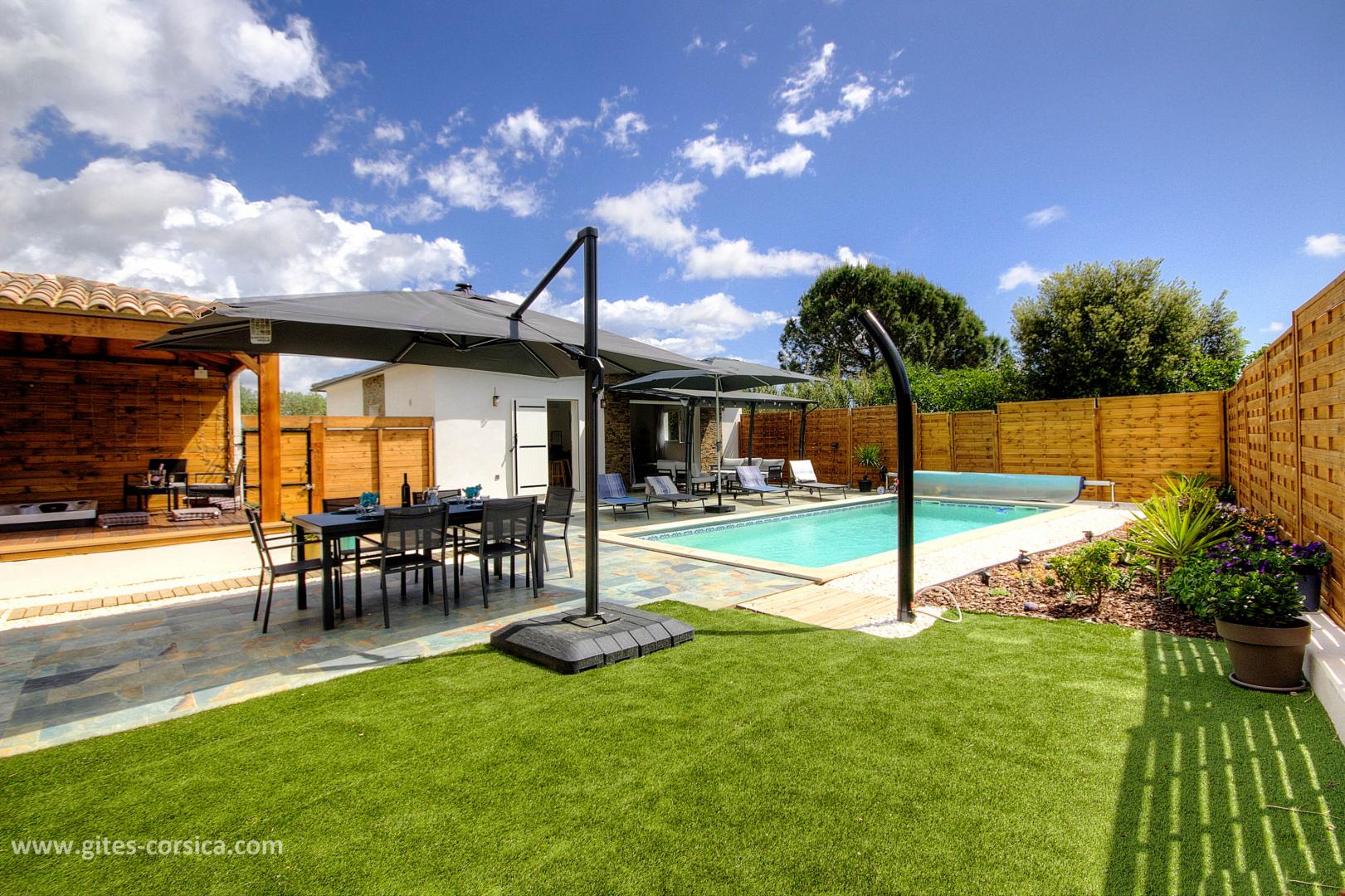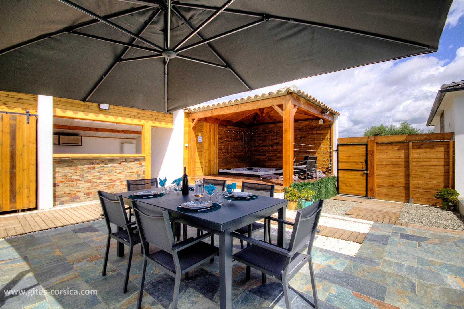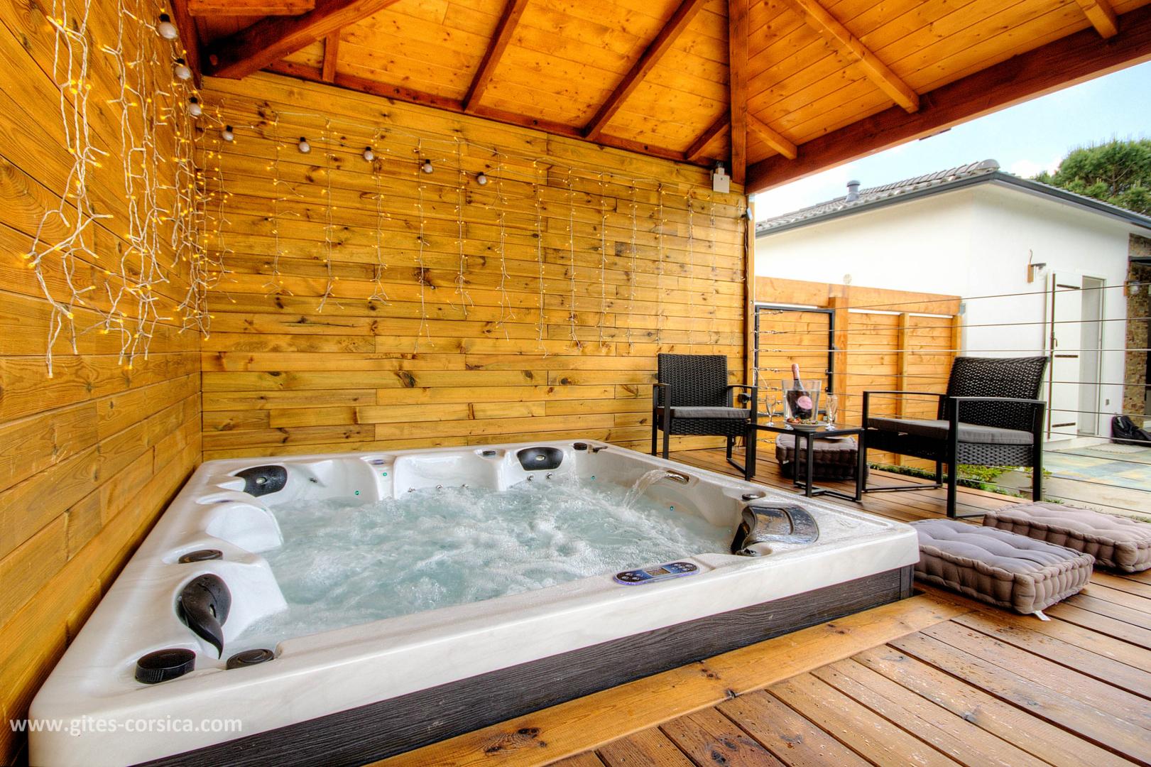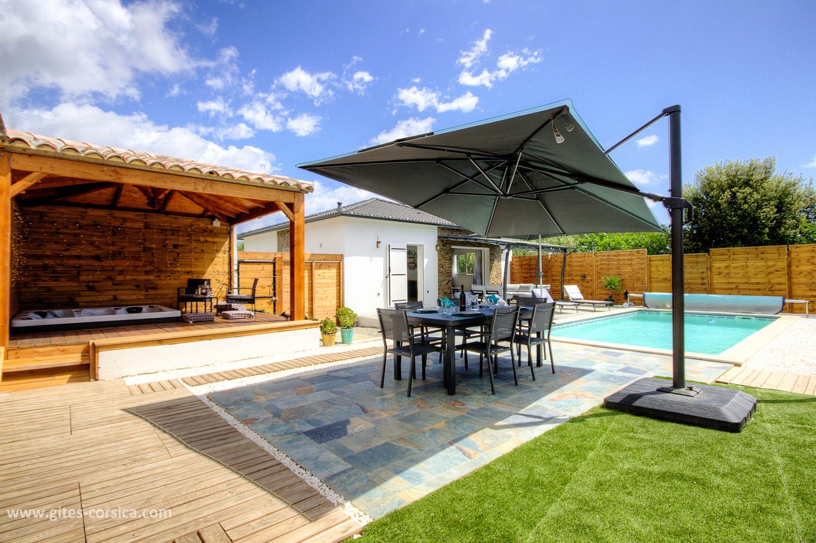 Sur une propriété de 6000 m² dans la plaine d'Antisanti, maison indépendante de 66 m² à proximité d'un autre gite (63842). Elle se compose ainsi : - Séjour/cuisine -1 chambre comprenant 1 lit en 180x200 cm avec salle d'eau/WC privative - 1 chambre comprenant 2 lits en 90x200 cm jumelables - Salle d'eau/WC Propriété sous vidéosurveillance avec enregistrement des images. Le dispositif sera activé uniquement après accord du locataire. Le client devra faire part de son, accord ou de son refus à la signature du contrat de location - Terrain privatif clos de 1000 m² - Terrasse de 70 m² dont 14 m² couverte - Salon de jardin - Salon de détente - 4 bains de soleil - Piscine (7,5x3,5 mètres, profondeur : 1,5mètres) ouverte et chauffée du 19 avril au 11 octobre, sécurisée par une alarme sonore. La piscine est à usage exclusif des locataires - Spa (2.2x2.2 mètres : 3 places assises et deux places allongées, ou 7 places assises), ouvert toute l'année, avec salle d'eau/WC - Cuisine d'été avec plancha gaz, feux gaz et réfrigérateur - Borne de recharge électrique (7 kW) - 2 places de stationnement dans la propriété (portail électrique à bip) En commun avec la deuxième location : - Salle de sport avec appareils de fitness (tapis de course, rameur, elliptique, vélo d'appartement), baby-foot, télévision, billard et enceinte connectée - Terrain de pétanque - Climatisation dans le séjour/cuisine et les 2 chambres - Combiné lave-linge/sèche-linge - Lave-vaisselle - Micro-ondes - Compartiment congélateur - Télévision dans le séjour et les 2 chambres - Wifi - Sèche-cheveux - Sèche-serviette - Lits faits à l'arrivée A réserver auprès des propriétaires et en supplément : - Petit-déjeuner (salé, sucré ou continental) - à partir de 8€/personne - Séances de massages (tarifs selon carte) - Coiffeuse (tarifs selon carte) - Ménage en cours de séjour (tarifs définis sur place)