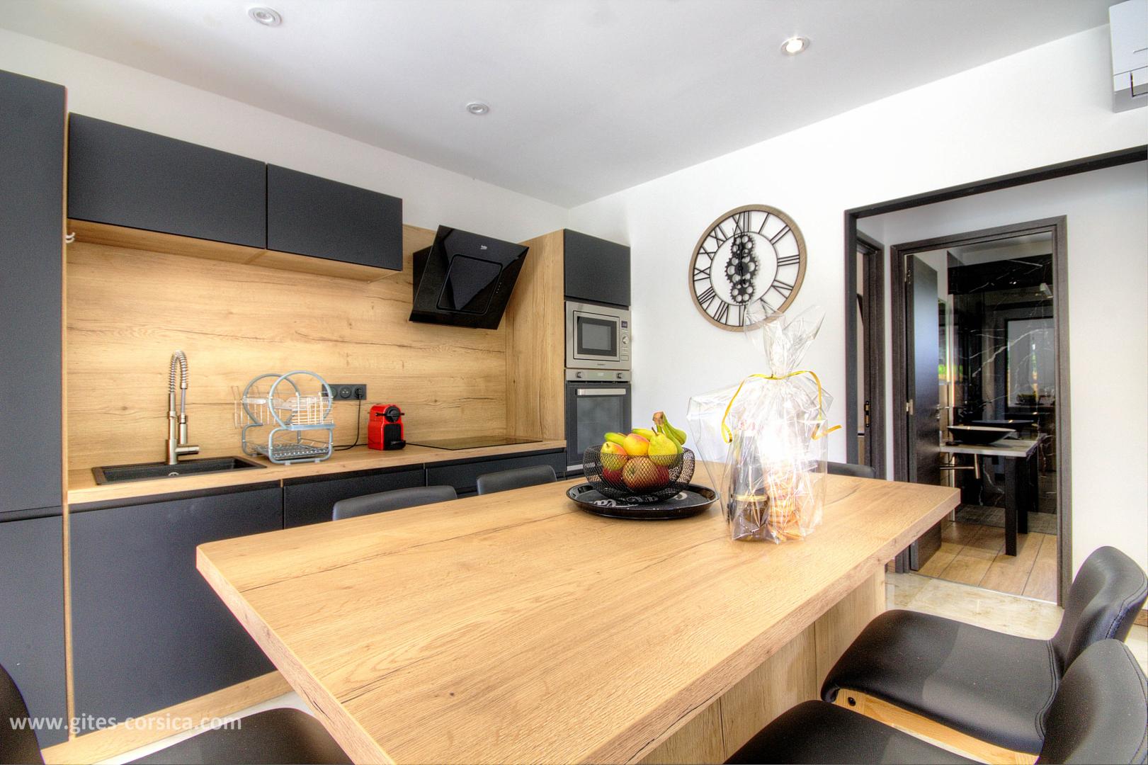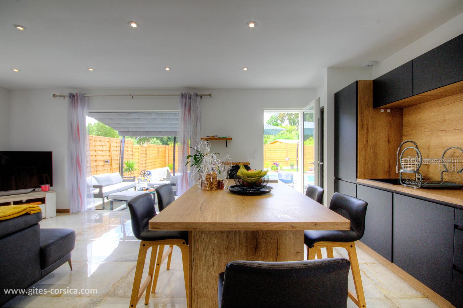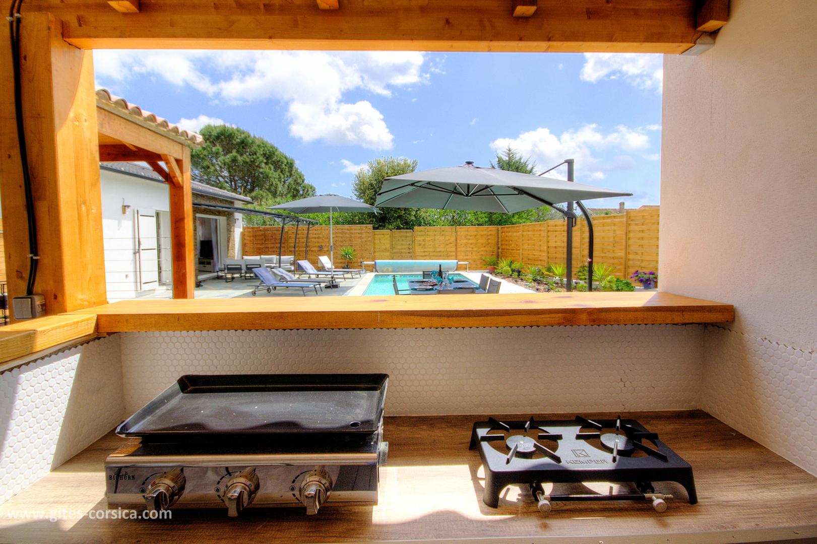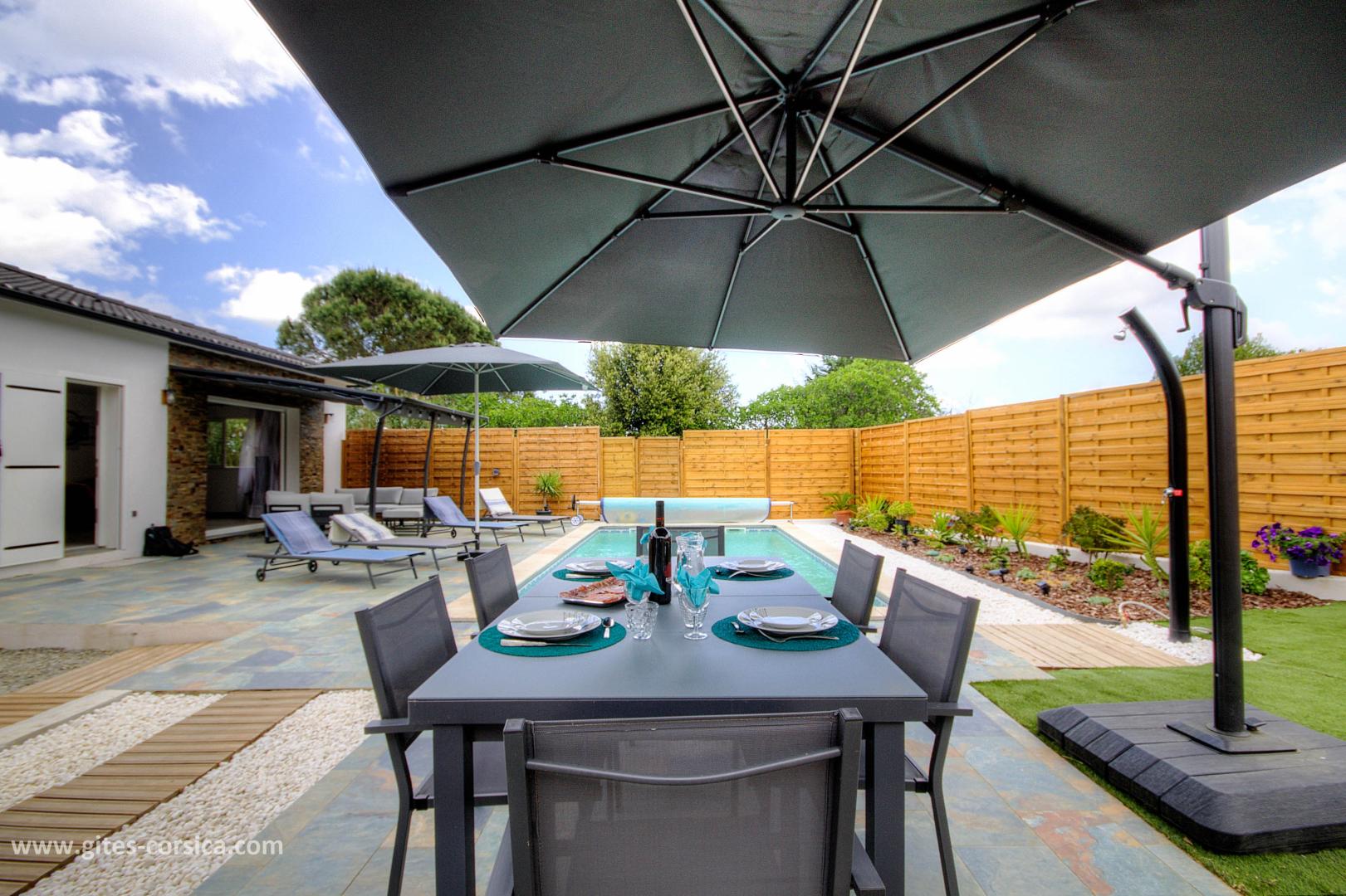 Sur une propriété de 6000 m² dans la plaine d'Antisanti, maison indépendante de 66 m² à proximité d'un autre gite (63842). Elle se compose ainsi : - Séjour/cuisine -1 chambre comprenant 1 lit en 180x200 cm avec salle d'eau/WC privative - 1 chambre comprenant 2 lits en 90x200 cm jumelables - Salle d'eau/WC Propriété sous vidéosurveillance avec enregistrement des images. Le dispositif sera activé uniquement après accord du locataire. Le client devra faire part de son, accord ou de son refus à la signature du contrat de location - Terrain privatif clos de 1000 m² - Terrasse de 70 m² dont 14 m² couverte - Salon de jardin - Salon de détente - 4 bains de soleil - Piscine (7,5x3,5 mètres, profondeur : 1,5mètres) ouverte et chauffée du 19 avril au 11 octobre, sécurisée par une alarme sonore. La piscine est à usage exclusif des locataires - Spa (2.2x2.2 mètres : 3 places assises et deux places allongées, ou 7 places assises), ouvert toute l'année, avec salle d'eau/WC - Cuisine d'été avec plancha gaz, feux gaz et réfrigérateur - Borne de recharge électrique (7 kW) - 2 places de stationnement dans la propriété (portail électrique à bip) En commun avec la deuxième location : - Salle de sport avec appareils de fitness (tapis de course, rameur, elliptique, vélo d'appartement), baby-foot, télévision, billard et enceinte connectée - Terrain de pétanque - Climatisation dans le séjour/cuisine et les 2 chambres - Combiné lave-linge/sèche-linge - Lave-vaisselle - Micro-ondes - Compartiment congélateur - Télévision dans le séjour et les 2 chambres - Wifi - Sèche-cheveux - Sèche-serviette - Lits faits à l'arrivée A réserver auprès des propriétaires et en supplément : - Petit-déjeuner (salé, sucré ou continental) - à partir de 8€/personne - Séances de massages (tarifs selon carte) - Coiffeuse (tarifs selon carte) - Ménage en cours de séjour (tarifs définis sur place)